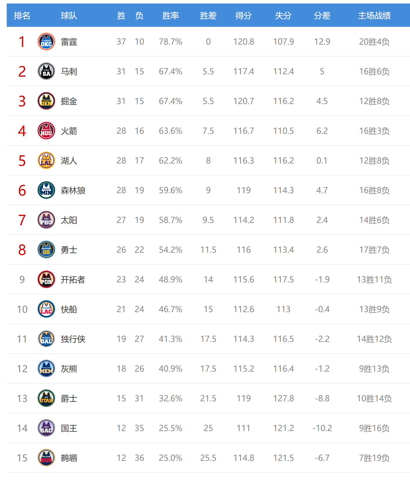今日比赛后太阳、森林狼排名互换,灰熊、独行侠排名互换,其他西部球队排名不变。